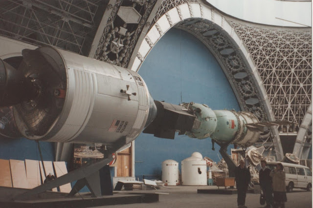 A US Apollo Space Craft connected to a Russian Soyuz in the Kosmos Museum, guide, Misha and Tamara.